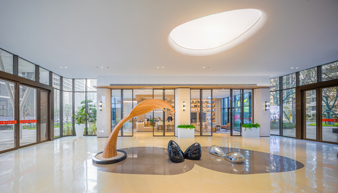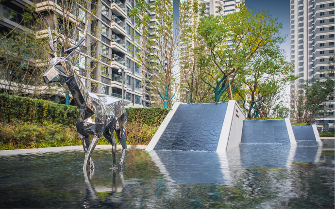 穿過歸家大堂,映入眼中的是大面積疊水瀑布景觀,飛花濺玉,水聲淙淙,錦鯉歡游;水系周圍,造型烏桕樹陣姿態遒勁,建筑與綠樹的倒影隨水波而流動,盡顯活力與生機。