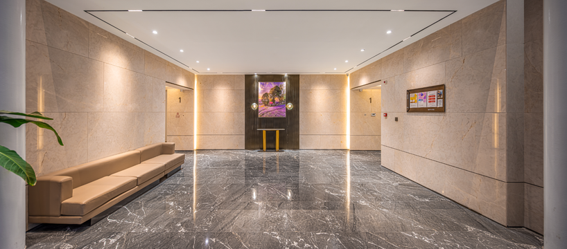 首層單元入戶大堂,同樣以高規格現代風格進行精裝,落地玻璃單元大門搭配金屬細節,呈現明亮、清雅的空間感,大堂空間全鋪設石材、以藝術畫裝點,綠植、休息沙發等也已就位,帶給居者舒適的視覺享受和品質體驗。